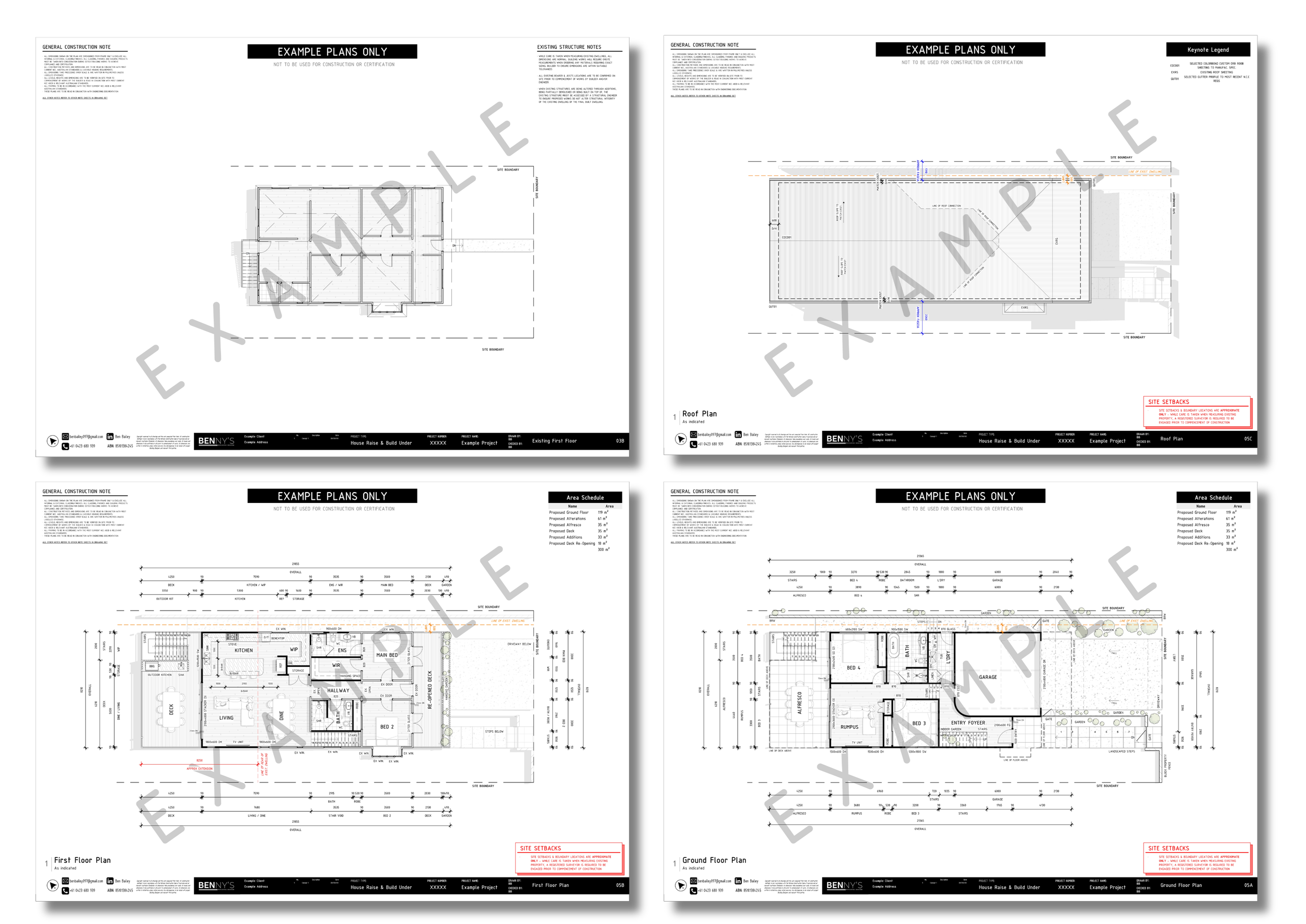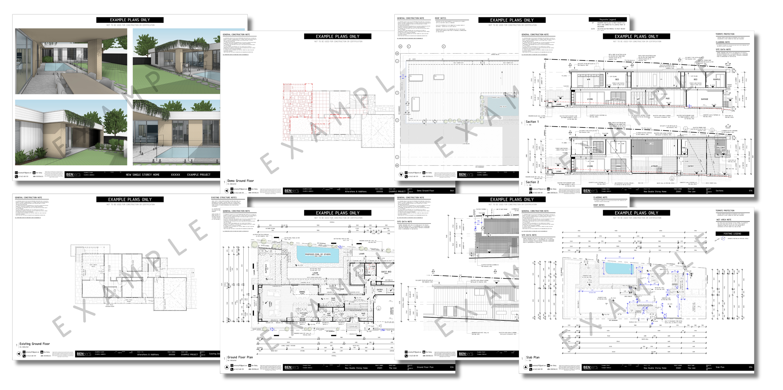 These plans will include all the detailed information required to clearly explain how the design is to be built such as Dimensioned Plans, Elevations, Sections, Slab Plans & Construction Details.